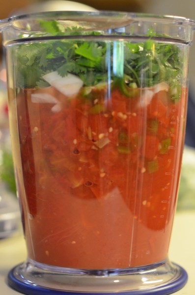 I’ve already packed up my food processor, so I used the blender to pull this together. Worked great! After adding the tomatoes and Rotel, I added some onion, jalapeno, and garlic.