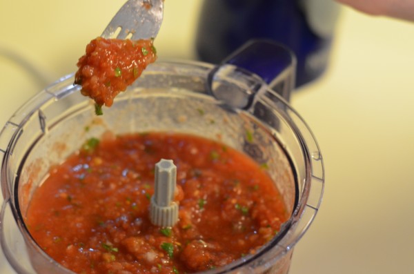 Phillip requested a chunkier salsa, so we only pulsed it long enough to get it blended. We adjusted the seasoning after tasting it and put it away to meld overnight.