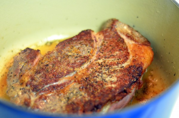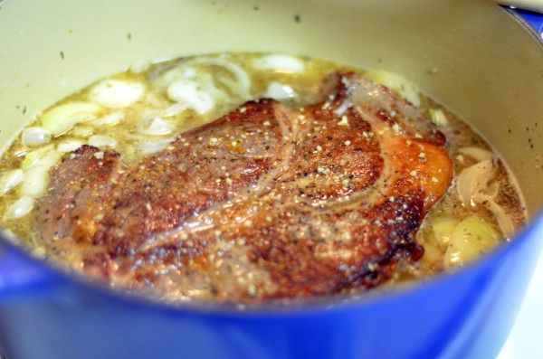 First, I seasoned a chuck roast with salt and pepper, and seared it in olive oil over medium-high heat.