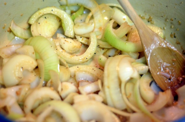 After removing the roast, I sauteed some chunky onions and some garlic for a few minutes.