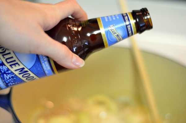 Next, I poured in the beer. We typically keep Blue Moon on hand, so that’s what I used. The recipe calls for cans, but I used bottles and I don’t think it made any difference.