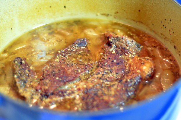 We kicked off our Sweet as Pie menu for the month with Beer-Braised Beef with Onions. This was super easy, very tasty, made excellent leftovers, and a great way to take advantage of chuck roast being on sale. Here’s how it came together: